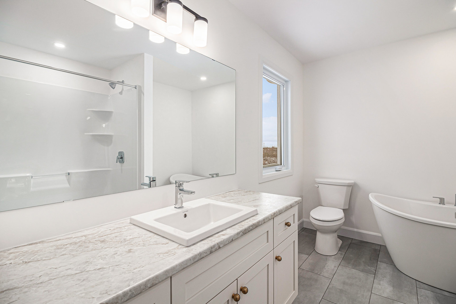 Armoires de salle de bain (selon le plan; sauf salle d’eau) avec portes style shaker en PVC, comptoirs laminés et lavabo de comptoir